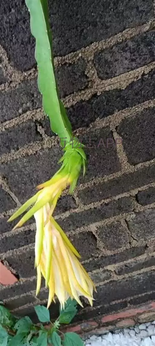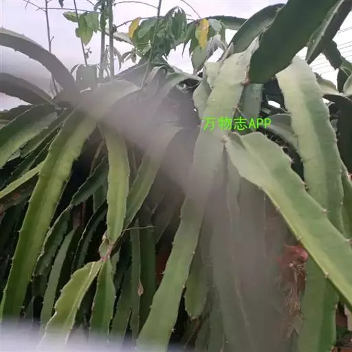 火龙果(学名:Hylocereus undatus 'Foo-Lon', 别名:红龙果、青龙果、仙蜜果、玉龙果)是仙人掌科、量天尺属量天尺的栽培品种,攀援肉质灌木,具气根。分枝多数,延伸,叶片棱常翅状,边缘波状或圆齿状,深绿色至淡蓝绿色,骨质;花漏斗状,于夜间开放;鳞片卵状披针形至披针形,萼状花被片黄绿色,线形至线状披针形,瓣状花被片白色,长圆状倒披针形,花丝黄白色,花柱黄白色,浆果红色,长球形,果脐小,果肉白色、红色。种子倒卵形,黑色,种脐小。7-12月开花结果。