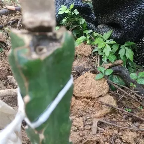 火龙果的气生根很多,可以转化为吸收根。进行扩穴改土,可逐渐扩宽根系分布;也可绑扎牵引诱导气生根下地。
