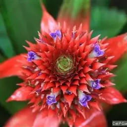 花序于叶丛中抽出,状如松球,长6-8厘米,结果时增大;苞片基部绿色,上半部淡红色,三角状卵形;萼片宽卵形,肉质,顶端带红色,长约1厘米;花瓣长椭圆形,端尖,长约2厘米,上部紫红色,下部白色;生于花序顶部的叶变小,常呈红色。基部鞘状,雨水沿叶面流入由叶鞘形成的贮水器中。花序顶生,圆锥花序。