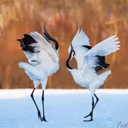 2月,已经有北迁的冲动,开始为回到繁殖地做准备。白头鹤的婚配是一雌一雄制。虽然它们在越冬地也是形影不离,但没有在越冬地交配的记录。偶尔的舞蹈和不同家庭的成员相互驱逐,维系着稳定的配偶关系。