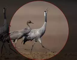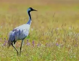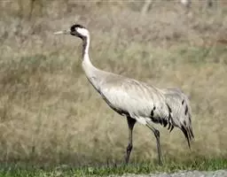 蓑羽鹤大型涉禽,体长68~92厘米,是鹤类中个体最小者。通体蓝灰色,眼先、头侧、喉和前颈黑色,…
