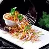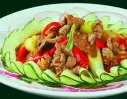 食材:牛肉250克,洋葱25克,胡萝卜25克,菜花25克,豌豆10克,口蘑5克,豆角10克,香菜10克,番茄10克,龙须菜5克。