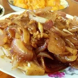 2、煎盘内放猪油,烧至五成热,将一半胡萝卜、洋葱及土豆、香菜分别炸至金黄色,捞出;将牛肉炸至暗红色时捞出;菜花、豆角、豌豆分别用水煮熟。