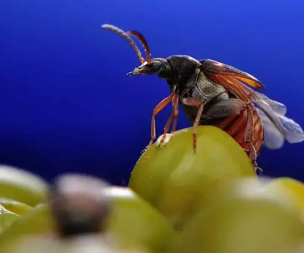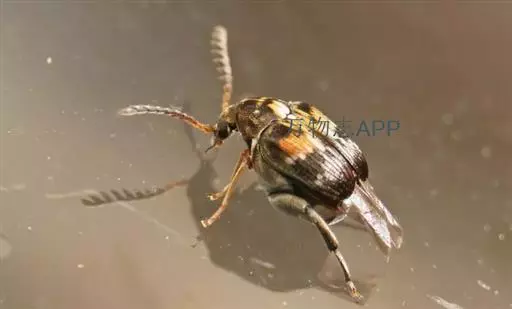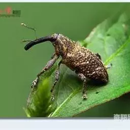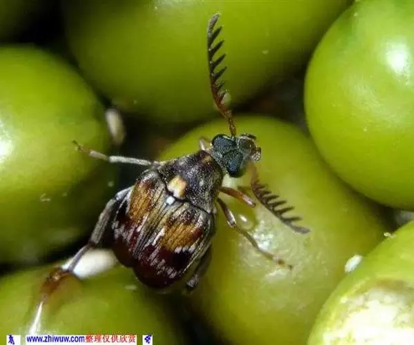 绿豆象 体长2—3.5mm,宽1.3—2mm,卵圆形,深褐色;头密布刻点,额部具一条纵脊,雄虫触角栉齿状,雌虫锯齿状;前胸背板后端宽,两侧向前部倾斜,前端窄,着生刻点和黄褐、灰白色毛,后缘中叶有1对被白色毛的瘤状突起,中部两侧各有一个灰白色毛斑。小盾片被有灰白色毛。鞘翅基部宽于前胸背板,小刻点密,灰白色毛与黄褐色毛组成斑纹,中部前后有向外倾斜的2条纹。臀板被灰白色毛,近中部与端部两侧有4个褐色斑。后足腿节端部内缘有一个长而直的齿,外端有一个端齿,后足胫节腹面端部有尖的内、外齿各一个。