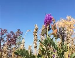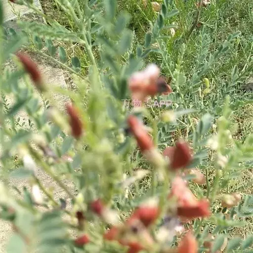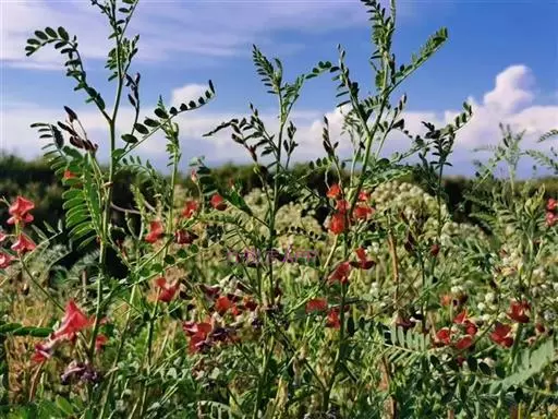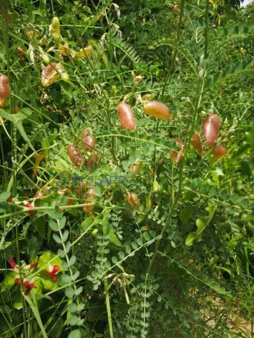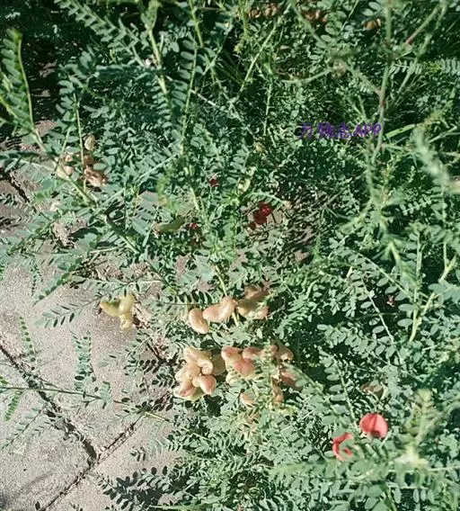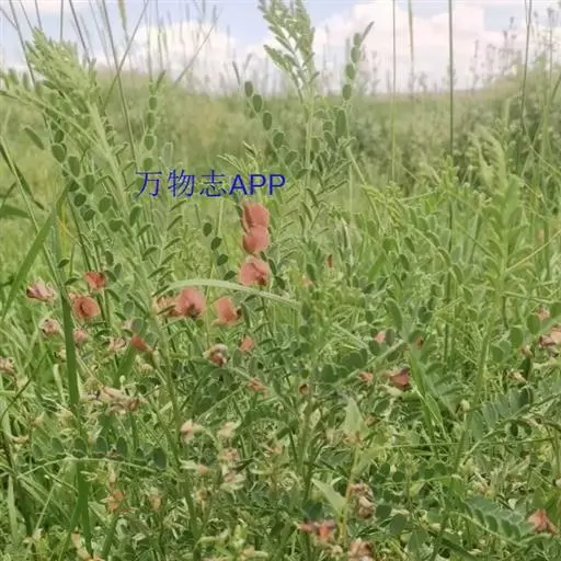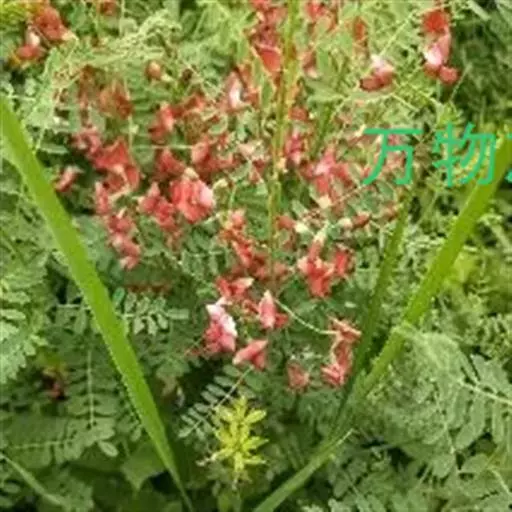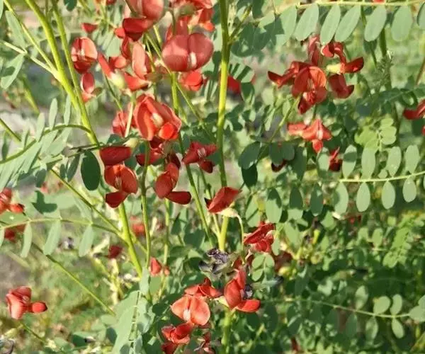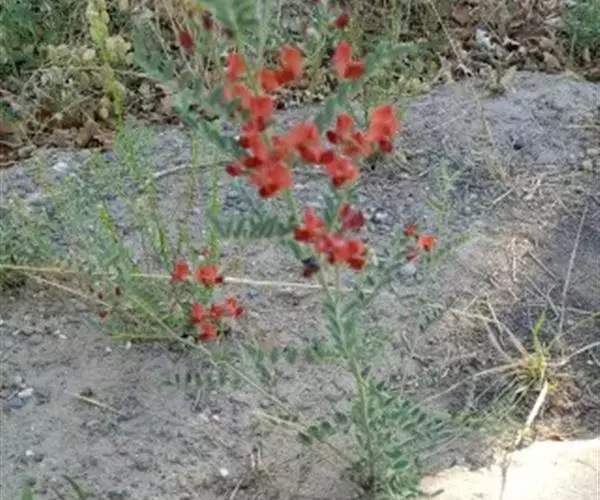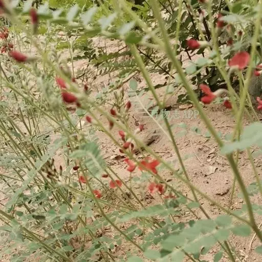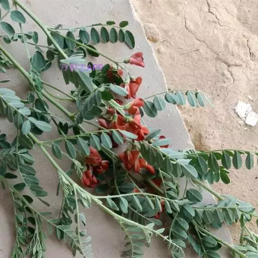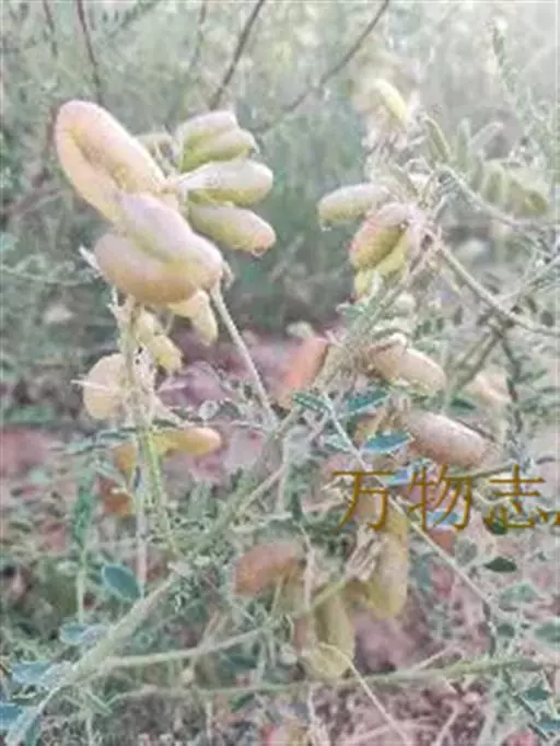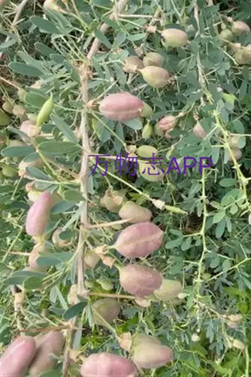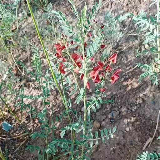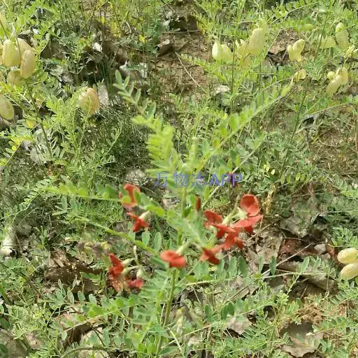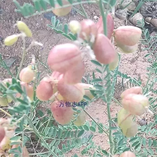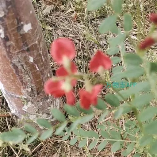 半灌木或多年生草本,茎直立或下部匍匐,高0.3-0.6米,稀达1.3米;枝开展,具纵棱脊,被疏至密的灰白色丁字毛;托叶线状披针形,三角形至钻形,自茎下部至上部渐变小。叶轴长5-8.5厘米,上面具沟槽;小叶11-21片,倒卵形至倒卵状长圆形,长5-15(25)毫米,宽3-6(10)毫米,先端微凹至圆,具短尖头,基部圆至宽楔形,上面疏被毛至无毛,侧脉不明显,下面被细小、白色丁字毛;小叶柄短,被白色细柔毛。总状花序常较叶长,长6.5-13(17)厘米,生6-16花;苞片卵状披针形;花梗长4-5毫米,密被白色柔毛,小苞片线形至钻形;花萼钟状,萼齿三角形,上边2齿较宽短,其余较窄长,外面被白色柔毛;花冠初呈鲜红色,后变紫红色,旗瓣瓣片近圆形,向外反折,长12-13毫米,宽12-16毫米,先端微凹,基部具短柄,翼瓣较龙骨瓣短,连柄长12毫米,先端圆,基部具长3毫米微弯的瓣柄及长2毫米先端圆的耳状裂片,龙骨瓣长13毫米,宽4-5毫米,瓣柄长约4.5毫米,裂片近成直角,先端钝;子房近线形,密被白色柔毛,花柱弯曲,仅内侧疏被纵列髯毛,柱头近球形。荚果椭圆形至卵圆形,膨胀,长1.7-3.5厘米,直径1.7-1.8厘米,先端圆,果颈长约10毫米,果瓣膜质,外面疏被白色柔毛,缝线上较密;种子肾形至近半圆形,长约2.5毫米,褐色,珠柄长1-3毫米,种脐圆形凹陷。花期5-8月,果期6-9月。
