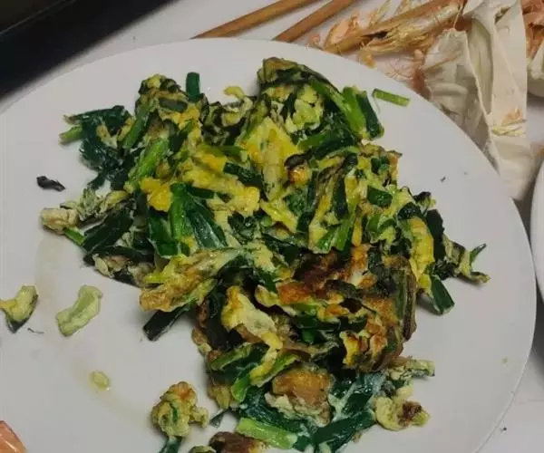 鸡蛋二个,韭菜50克,虾皮10克。调料:植物油15克,姜末3克,盐0.5克,味精0.5克。
