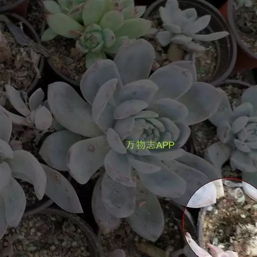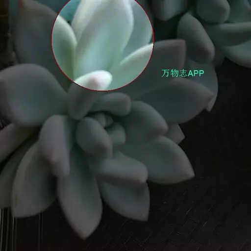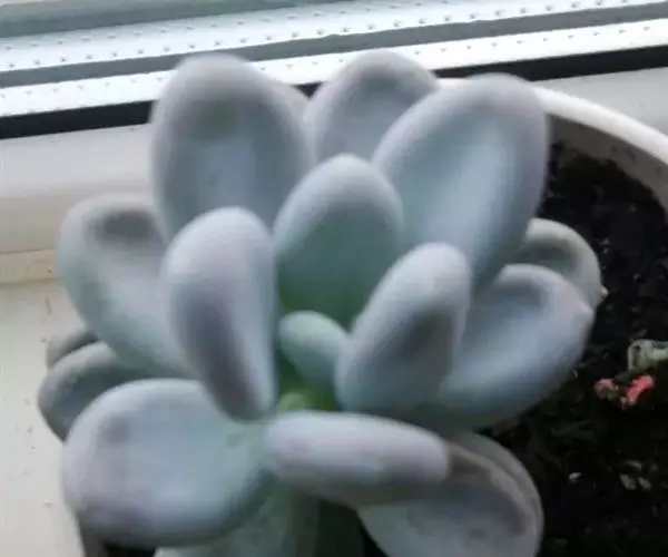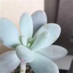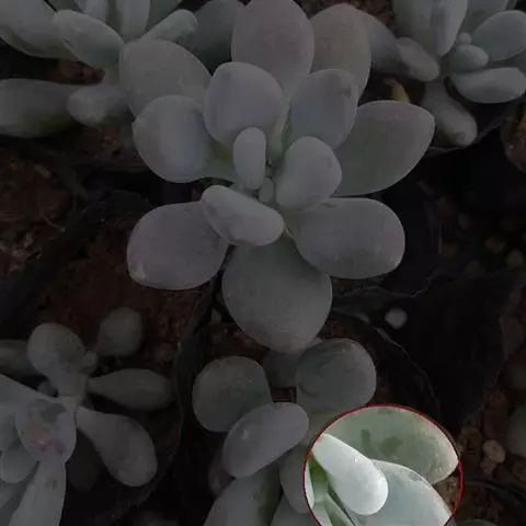 肉质叶互生,呈延长的莲座状排列,倒卵形至倒卵状椭圆形,长3~5厘米,宽1.8~3厘米,厚约0.8~1.7厘米,先端圆钝,表面平滑,叶色从泛蓝的灰绿色至淡紫色不等,被有浓厚的白粉。
