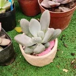 星美人是景天科、厚叶草属,多年生多肉类草本植物。茎直立,肉质叶互生,呈延长的莲座状排列,倒卵形至倒卵状椭圆形,长先端圆钝,表面平滑,叶色从泛蓝的灰绿色至淡紫色不等,被有浓厚的白粉。花瓣椭圆形,紫红色至红色不等。裂片直立。花药淡黄色。