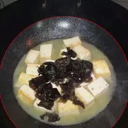 4. 放入木耳和山药,炒1分钟后放盐,把盐炒匀