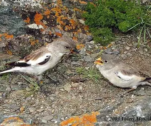 白斑翅雪雀(学名:Montifringillla nivalis):属典型的高原鸟类,共有7个亚种,体重30-34克,体长142-169毫米,较雪雀属中其他种体型稍大;雄鸟头灰,颏黑,翕和肩富于褐色;翼大部白色;除一对中央尾羽黑色外其余均为白色而具黑色羽端,飞行时尾部呈中间黑、两边白的形态。雌鸟像雄鸟,但中覆羽底色常显暗色。初级飞羽9枚,外侧飞羽的淡色羽缘(第一枚除外)在羽基和近端处,形稍扩大,互相骈缀,略成两道横斑状,在飞翔时尤见明显。嘴短粗而强壮,呈圆锥状,嘴峰稍曲。