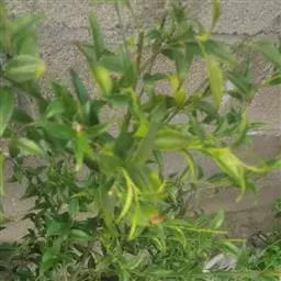 直立分枝的灌木状草本。茎圆柱形,上部近四棱形。叶对生;叶柄长2-7(-10)mm,稍粗壮;叶片革质,披针形,长4-10cm,宽2-2.5cm,先端渐尖或长尖,基部楔形或稍下延,侧脉2-3对,两面光滑无毛。聚伞花序三歧分枝,圆锥花序式排列,顶生或生于上部叶腋;苞片披针形;花序中央的花无梗,两侧的有短梗;萼简陀螺状,长3mm,裂片卵状三角形,与萼简等长;花冠白色或淡紫色,漏斗状,长6-10mm,裂片披针形,长2-2.5mm;雄蕊伸出。蒴果椭圆形,长4mm,有宿存的萼裂片,两瓣裂。