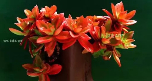 火祭 火祭鲜红的肉质叶是其独特与魅力所在,养护简单,观赏价值较高。如燃烧的火焰般给人以蓬勃向上的热情活力之感,感染力非常强。在晚秋至初春的冷凉季节叶色尤为鲜亮,非常应景。