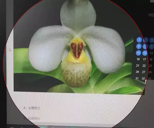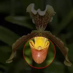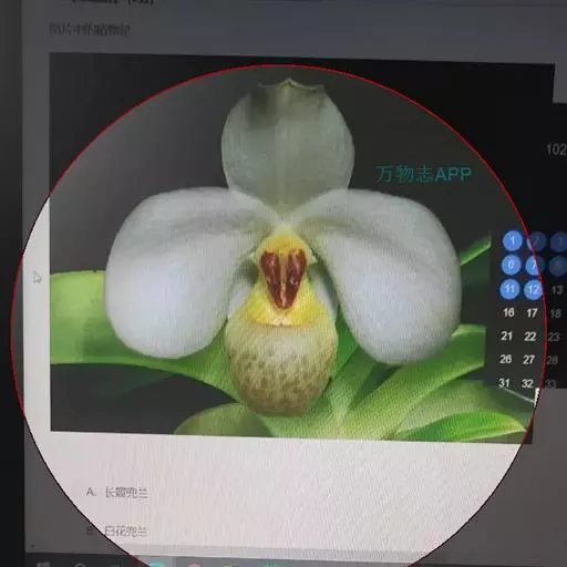 花葶直立,长11-12厘米或更短,淡绿黄色,被疏柔毛,顶端生1花;花苞片黄绿色,宽椭圆形,长达3.8厘米,宽约2厘米,近白色;花梗和子房长约5厘米,被疏柔毛;花大,直径8-9厘米,白色,有时带极淡的紫蓝色晕,花瓣基部有少量栗色或红色细斑点,唇瓣上有时有淡黄色晕,通常具不甚明显的淡紫蓝色斑点,退化雄蕊淡绿色并在上半部有大量栗色斑纹;中萼片椭圆状卵形,长4.5-4.8厘米,宽3.8-4.5厘米,先端钝,两面被短柔毛,背面略有龙骨状突起;合萼片宽椭圆形,长与宽各4.5-4.8厘米,先端钝,背面略有2条龙骨状突起;花瓣宽椭圆形至近圆形,长约6厘米,宽约5厘米,先端钝或浑圆,两面略被细毛;唇瓣深囊状;近卵形或卵球形,长达3.5厘米,宽约3厘米,基部具短爪,囊口近圆形,整个边缘内折,囊底具毛;退化雄蕊鳄鱼头状,长达2厘米,宽约1厘米,上面中央具宽阔的纵槽,两侧边缘粗厚并近直立。花期4-5月。 [4-5]