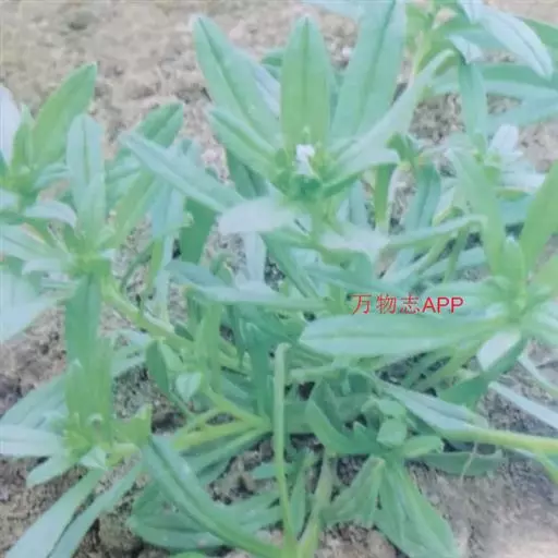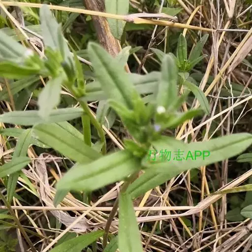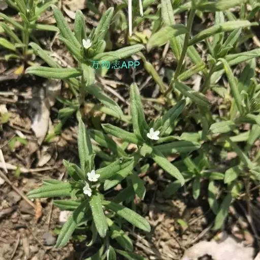 一年生草本。根稍含紫色物质。茎通常单一,高15-35厘米,自基部或仅上部分枝有短糙伏毛。叶无柄,倒披针形至线形,长2-4厘米,宽3-7毫米,先端急尖,两面均有短糙伏毛。聚伞花序生枝上部,长可达10厘米,苞片与叶同形而较小;花序排列稀疏,有短花梗;花萼裂片线形,长4-5.5毫米,通常直立,两面均有短伏毛,果期长可达11毫米且基部稍硬化;花冠高脚碟状,白色,有时蓝色或淡蓝色,筒部长约4毫米,外面稍有毛,檐部长约为筒部的一半,裂片卵形或长圆形,直立或稍开展,长约1.5毫米,稍不等大,喉部无附属物,但有5条延伸到筒部的毛带;雄蕊着生花冠筒下部,花药长约1毫米;花柱长1.5-2毫米,柱头头状。小坚果三角状卵球形,长约3毫米,灰褐色,有疣状突起。花果期4-8月。