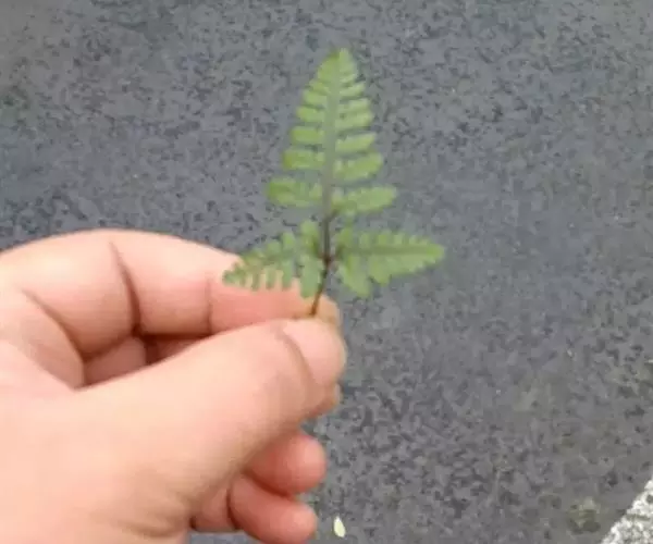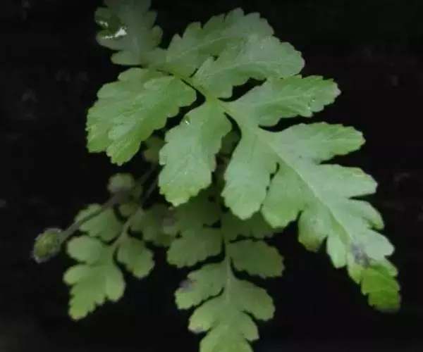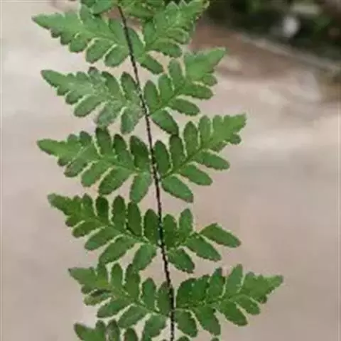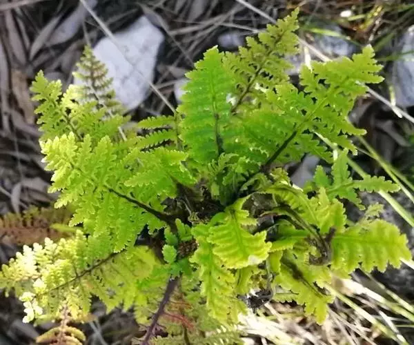 植株高10-30厘米。根状茎短而直立,被栗黑色披针形鳞片。叶簇生,柄长2-5厘米,亮栗色,密被红棕色披针形和钻状披针形鳞片以及少数短毛,向上直到叶轴上面有纵沟,沟两侧有隆起的锐边,其上有棕色粗短毛;叶片长8-25厘米,中部宽(2)4-6厘米,披针形,短渐尖头,向基部略变狭,二回羽状全裂;羽片10-20对,斜展,几无柄,中部羽片最大,长1.5-3.5厘米,基部宽1-1.5厘米,三角状披针形,先端短尖或钝,基部上侧与羽轴并行,下侧斜出,深羽裂;裂片长圆形或长舌形,无柄,或基部下延而有狭翅相连,钝头,边缘有圆齿;下部羽片略渐缩短,彼此疏离,有阔的间隔,基部一对三角形。叶脉在裂片上羽状,单一或分叉,极斜向上,两面不显。叶干后草质,绿色或棕绿色,两面无毛,羽轴下面下半部栗色,上半部绿色。孢子囊群圆形,生小脉顶端,位于裂片的圆齿上,每齿1-2枚;囊群盖椭圆肾形或圆肾形,黄绿色,宿存,彼此分离。 毛轴碎米蕨