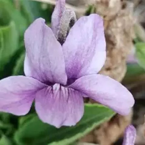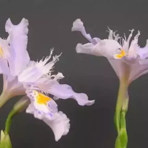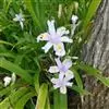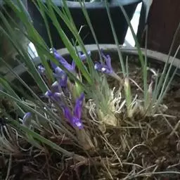花茎甚短,不伸出地面;花1-2朵,淡蓝色、红紫色或白色,有香味,直径2.5-3厘米;花被裂片6,2轮排列,内、外轮花被裂片皆为倒卵形,顶端钝,长4-5厘米;雄蕊直立,长2.5厘米,花药黄色,顶端尖,略弯曲;花柱橙红色,长约4厘米,上部3分枝,分枝弯曲而下垂,柱头略扁,顶端楔形,有浅齿,较雄蕊长,子房狭纺锤形。蒴果椭圆形,长约3厘米。