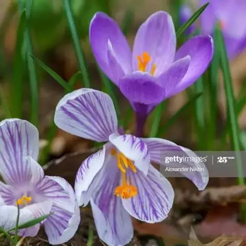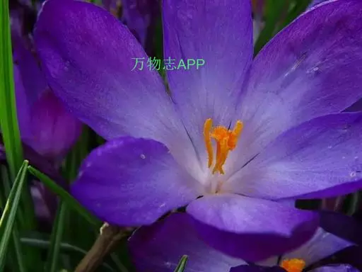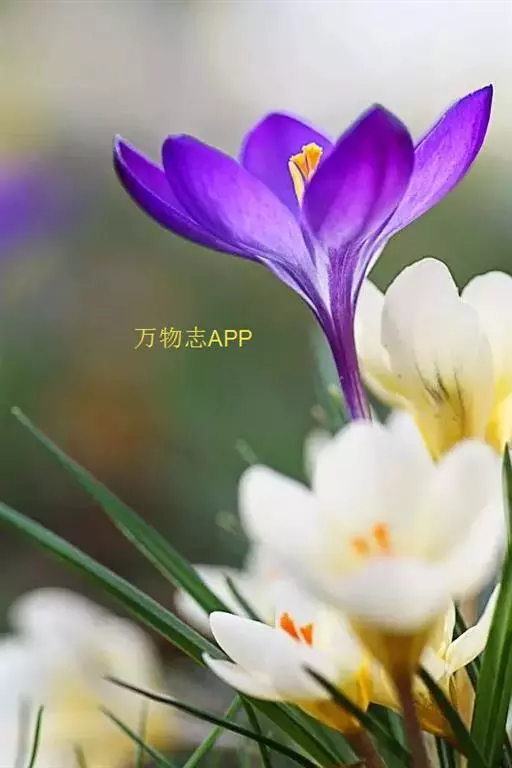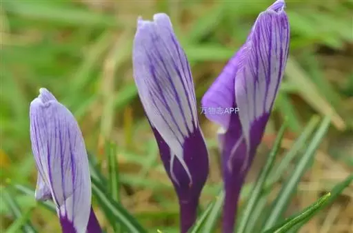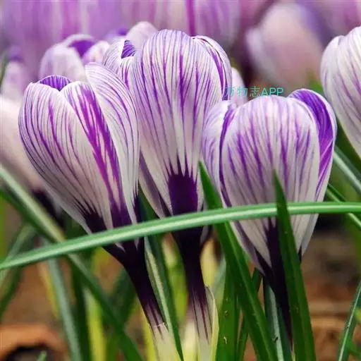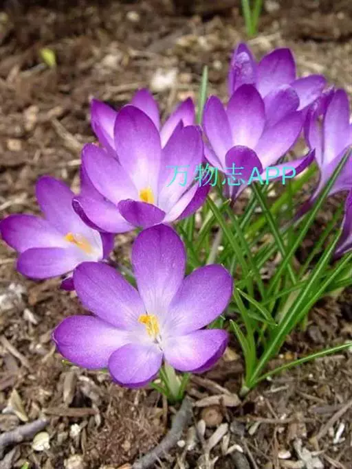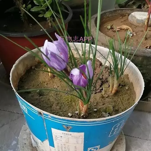 番红花是多年生草本植物。球茎扁圆球形,直径约3厘米,外有黄褐色的膜质包被。叶基生,9-15枚,条形,灰绿色,长15-20 厘米,宽2-3毫米,边缘反卷;叶丛基部包有4-5片膜质的鞘状叶。