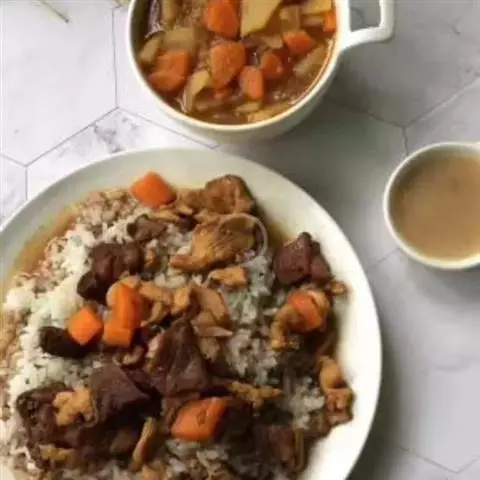 咖喱牛肉饭是一道菜品,起源于香料大国印度,使用印度特有的香料咖喱粉制作而成。