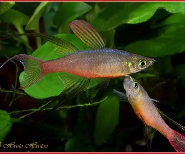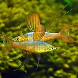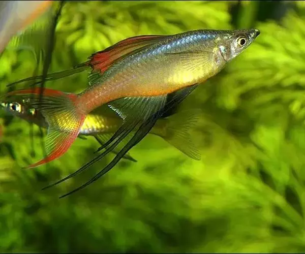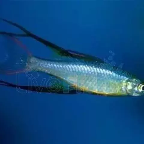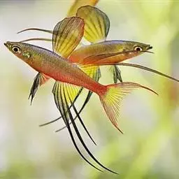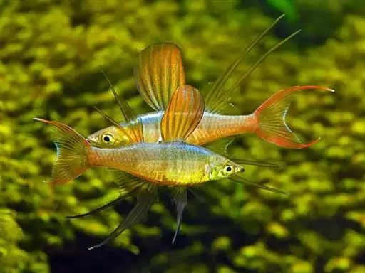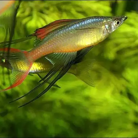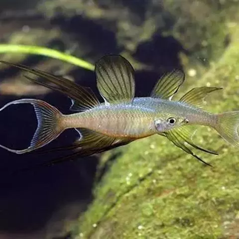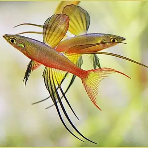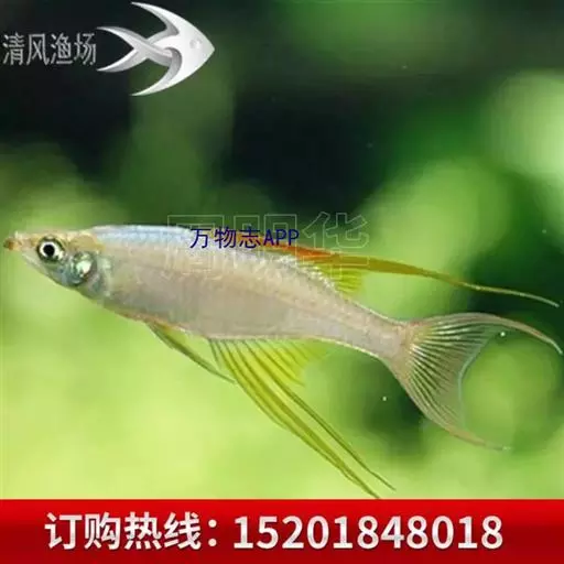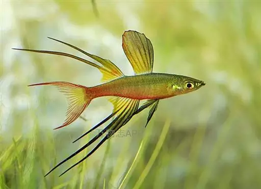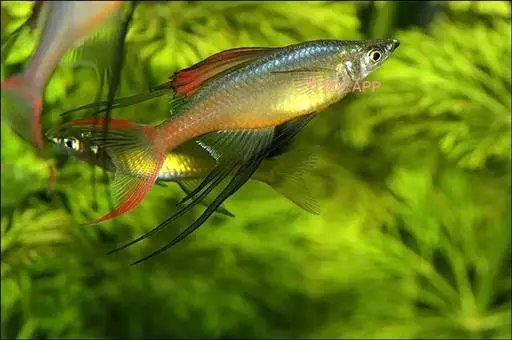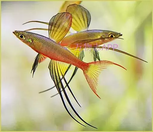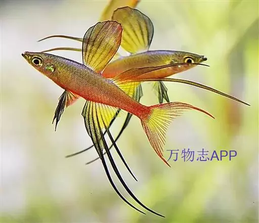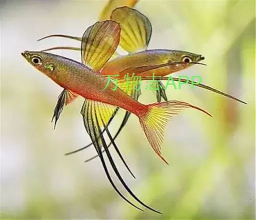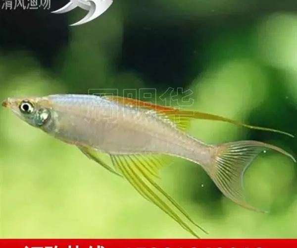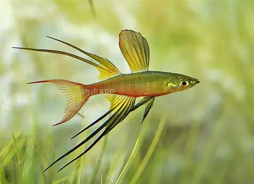身体为尖梭形,腹部圆,尾柄长。体背部青色,腹部金黄色,体侧中央从眼晴到尾柄方向一条金黄色带。背 鳍挺拔修长,鳍条末梢尖长,向后廷伸起过尾鳍。腹鳍变异为两根长长的尖鳍,形似燕子。