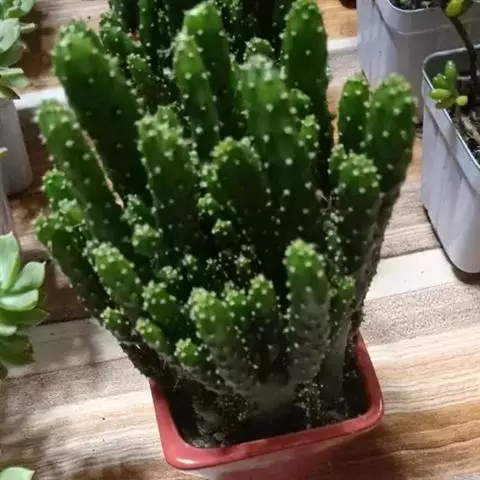 直立茎高2~4m,主茎粗5~1Ocm,茎节上有规律地交又排列着长圆形瘤突。细圆柱形肉质叶着生于茎节上部,1Ocm长,通常宿存,可存在3~4年,除非特别干旱和生长不良,一般不会全部脱落。刺座有少许黄色钩毛和1~2根淡黄色的刺,刺长8cm。夏日开红花,花径2cm。