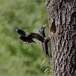 黑啄木鸟(学名:Dryocopus martius)属鴷形目、啄木鸟科,是一种大型的啄木鸟,体长45-47厘米,翼展64-68厘米,体重300-350克,寿命11年。是啄木鸟中最大的一种。通体几纯黑色;雄鸟额、头顶和枕全为血红色;雌鸟仅后头有血红色。