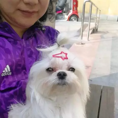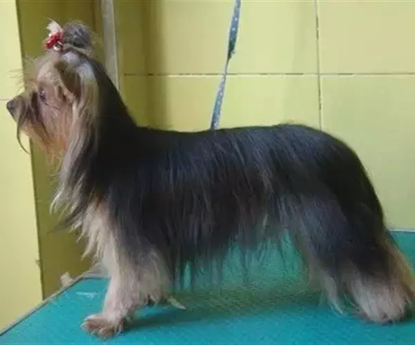 被毛有光泽、精致、柔滑如丝,由头颈、躯干倾泻而下,光彩夺目。身体上的被毛长度足以拖到地上而且十分直。头顶的毛发可以梳到中间结起来用丝带装饰,或从中间分开,向两边梳,并结成两个髻。口吻上的毛发非常长 。