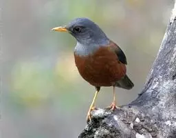 • 灰头鸫:中型鸟类,体长23-27厘米。整个头、颈和上胸褐灰色,两翅和尾黑色,上、下体羽栗棕色。…