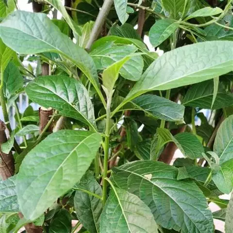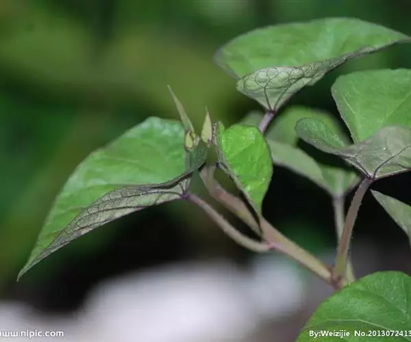 单叶对生或茎上部,少数三叶轮子生,叶片短,倒卵形或披针形,边缘有浅锯齿,两面被短茸毛,绿或浓绿色,叶脉三出,甜味极高。叶片有类似发霉状白毛产生,是汁液的正常分泌,多见于下雨天采集所致。