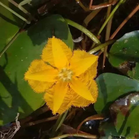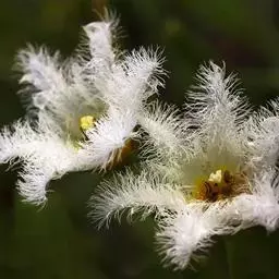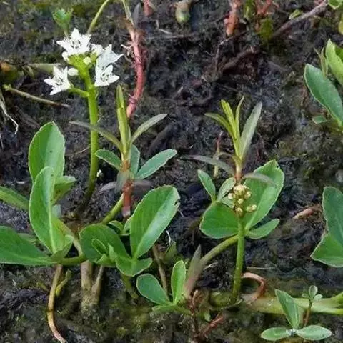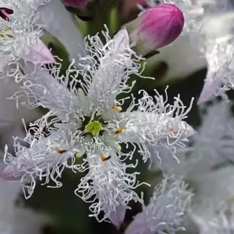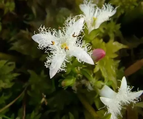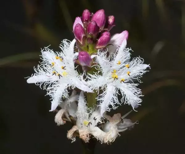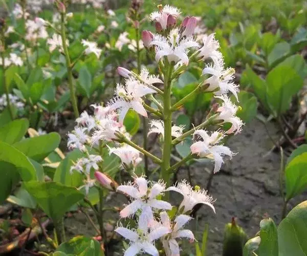 睡菜(学名:Menyanthes trifoliata L.)整株挺水植物,全株光滑无毛。根状茎匍匐状,叶基生,三出复叶、椭圆形,总柄长23-30厘米,全缘状微波形。总状花序顶生,基部生一披针形苞叶。小花具柄,直径1-2厘米;花冠5深裂,白色,有纤毛;雄蕊5枚,红色;子房上位,蒴果球形。花期5-7月,果期6-8月。