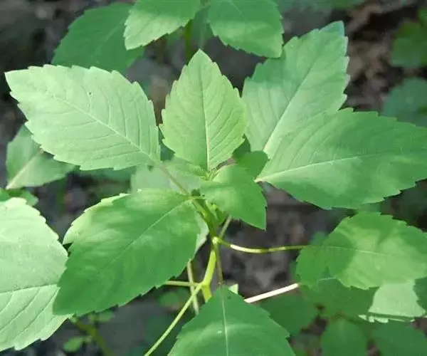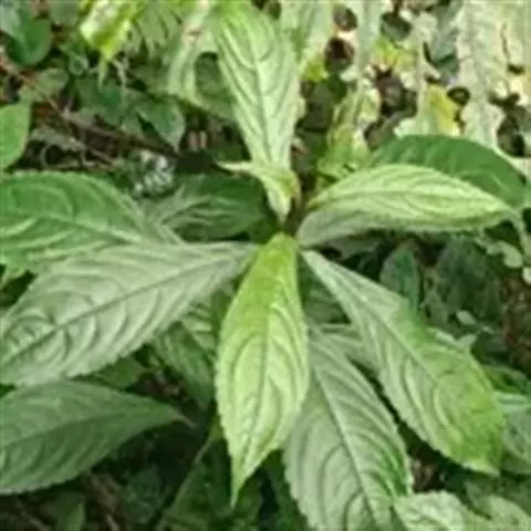 叶互生;叶片卵形或卵状椭圆形,长3-8厘米,宽1.5-4厘米,先端钝,稀急尖,基部圆钝或宽楔形,边缘有粗圆齿状齿,齿端具小尖,两面无毛,上面深绿色,下面灰绿色;叶柄纤细,长2-5厘米。最上部的叶柄更短或近无柄。