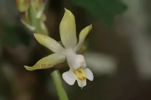 无距虾脊兰:假鳞茎近圆锥形,粗约1厘米,具3-4枚鞘和2-3枚叶。叶在花期尚未完全展开,…