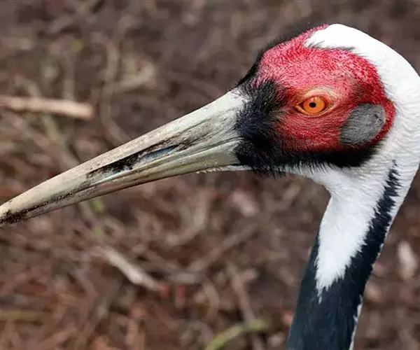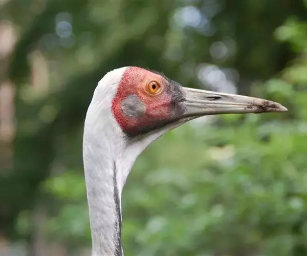 白枕鹤又叫红脸鹤、红面鹤,是大型涉禽。虹膜暗褐色,嘴黄绿色,脚红色。前额、头顶前部、眼先、头的侧部以及眼睛周围的皮肤裸出,均为鲜红色,其上着生有稀疏的黑色绒毛状羽。耳羽为烟灰色。头顶的后部、枕部、后颈、颈侧和前颈的上部形成一条暗灰色条纹,颊部和喉部为白色。颈侧和前颈的下部以及下体呈暗石板灰色。上体为石板灰色。尾羽为暗灰色,末端具有宽阔的黑色横斑。翅膀上的初级飞羽为黑褐色,具有白色的羽干纹,次级飞羽也是黑褐色,基部白色,三级飞羽为淡灰白色,延长成弓状,翅膀上的覆羽为灰白色,初级覆羽黑色,末端白色。三国吴陆玑《毛诗陆疏广要》说