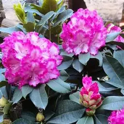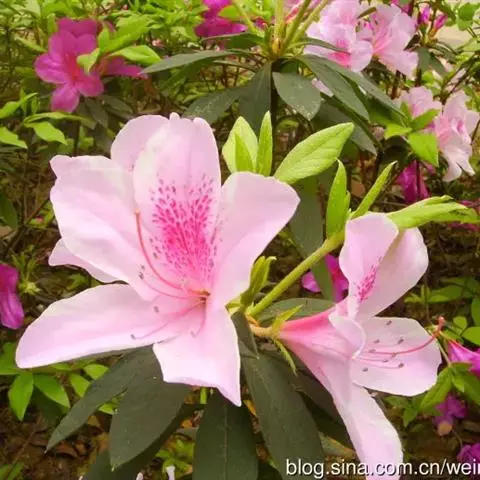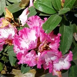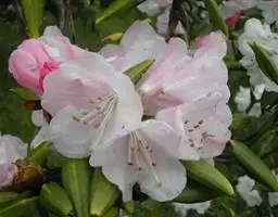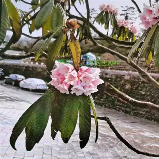 美容杜鹃(学名:Rhododendron calophytum Franch):常绿灌木或小乔木,高2-12米;树皮黄灰色或棕褐色,片状剥落;幼枝粗壮,绿色或带紫色。冬芽顶生,阔卵圆形。叶厚革质,长圆状倒披针形或长圆状披针形,上面亮绿色,下面淡绿色。顶生短总状伞形花序,有花15-30朵;花冠阔钟形,长4-5厘米,直径4-5.8厘米,红色或粉红色至白色,基部略膨大,内面基部上方有1枚紫红色斑块。蒴果斜生果梗上,长圆柱形至长圆状椭圆形。花期4-5月,果期9-10月。