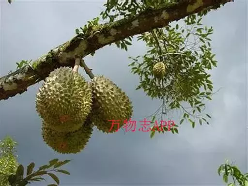 榴莲 常绿乔木,高可达25米,幼枝顶部有鳞片。托叶长1.5-2厘米,叶片长圆形,有时倒卵状长圆形,短渐尖或急渐尖,基部圆形或钝,两面发亮,上面光滑,背面有贴生鳞片,侧脉10-12对,长10-15厘米,宽3-5厘米;叶柄长1.5-2.8厘米,聚伞花序细长下垂,簇生于茎上或大枝上,每序有花3-30朵;花蕾球形;花梗被鳞片,长2-4厘米。