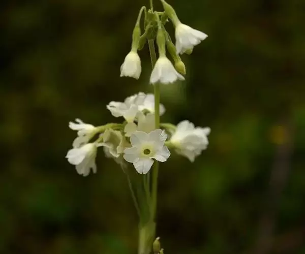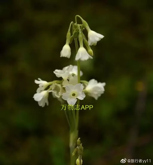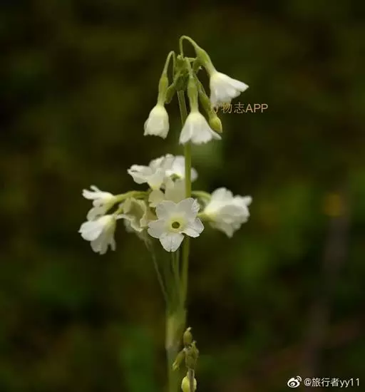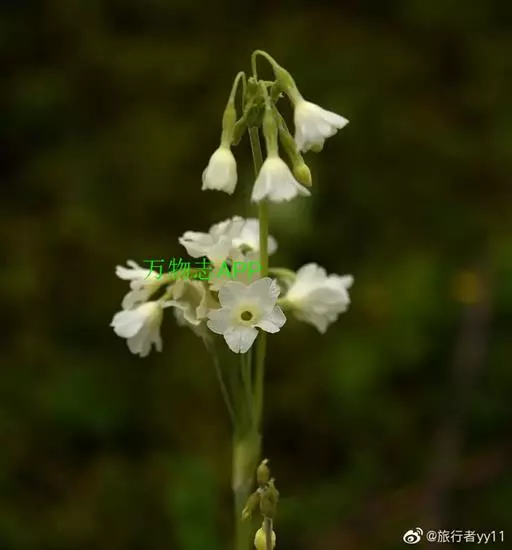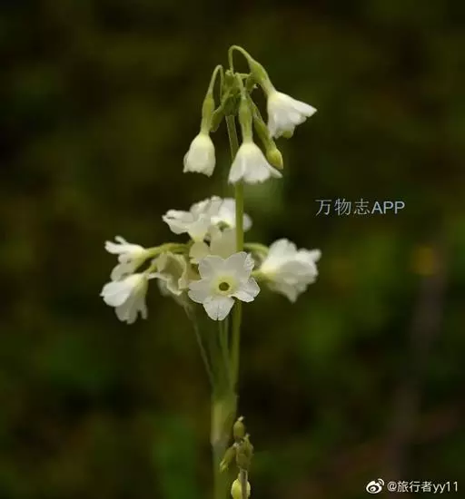 花葶高15-90厘米,顶端微被粉;伞形花序通常2-4轮,每轮5至多花;苞片窄披针形或矩圆形以至卵形,长6-20毫米,宽1.5-5 (8)毫米,绿色或带红褐色,通常被粉;花梗长1-8厘米,被淡黄色粉;花萼钟状或窄钟状,长7-10毫米,具5脉,外面被小腺体和稀薄黄粉,内面密被黄粉,分裂达全长的1/4-1/3,裂片三角形至披针形,先端锐尖,微向外反;花冠黄色、紫色或白色,冠筒长11-13毫米,筒口周围被黄粉,冠檐直径1.2-3厘米,裂片阔倒卵形至近圆形,先端具凹缺;长花柱花:雄蕊距冠筒基部约3毫米着生,花柱长达冠筒口;短花柱花:雄蕊近冠筒口着生,花柱长约2毫米。