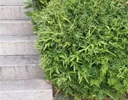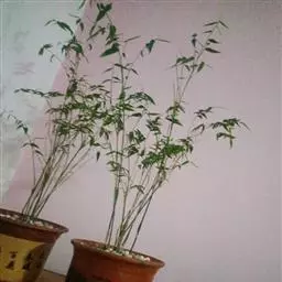 凤尾竹 Raeusch. ex Schult. ’Fernleaf’ R. A. Young)是禾本科,簕竹属孝顺竹的变种。植株较高大,杆高可达6米,竿中空,小枝稍下弯,下部挺直,绿色;竿壁稍薄;节处稍隆起,无毛;叶鞘无毛,纵肋稍隆起,背部具脊;叶耳肾形,边缘具波曲状细长繸毛;叶舌圆拱形,叶片线形,上表面无毛,下表面粉绿而密被短柔毛,小穗含小花,中间小花为两性;外稃两侧稍不对称,长圆状披针形,先端急尖;内稃线形,脊上被短纤毛,花药紫色,子房卵球形,羽毛状。成熟颖果未见。原产中国,华东、华南、西南以至台湾、香港均有栽培。凤尾竹喜温暖、湿润和阳光充足的环境,耐寒。宜土层深厚、肥沃、疏松的微酸性壤土。该种观赏价值较高,宜作庭院丛栽,也可作盆景植物。全草或根入药,味淡、微苦,性寒,有清热利湿、凉血止血、消肿解毒功效,可治痢疾、泄泻等多种病症。凤尾