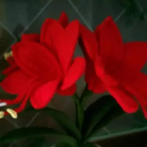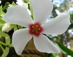 聚伞花序腋生或顶生,有花2-3朵;花萼5深裂,内面无腺体或腺体不明显,萼片披针形或钻状渐尖,长约3毫米;花冠红色,高脚碟状,花冠筒圆筒状,长约2.6厘米,内面具疏柔毛,喉部紧缩,具刚毛;花冠裂片宽倒卵形,长和宽约1.5厘米;雄蕊着生于花冠筒的上半部,但花药隐藏于花喉之内,与柱头离生;子房和花盘与属的特征相同。