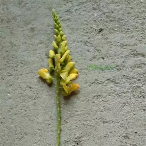 总状花序顶生或腋生,长10-15厘米,直立,花后延长达30厘米,下垂,被短柔毛;花梗基部具线状长圆形小苞片,早落;萼片5,早落,具缘毛,外面3枚小,不等大,上面1枚盔状,长6-7毫米,其余2枚卵形至椭圆形,长3毫米,里面2枚大,花瓣状,斜倒卵形,长1.5厘米,宽7-8毫米,先端圆形,基部渐狭;花瓣正黄色,3枚,侧生花瓣长圆形,长约10毫米,2/3以上与龙骨瓣合生,先端几截形,基部向上盔状延长,内侧无毛,龙骨瓣盔状,长约12毫米,鸡冠状附属物具柄,流苏状,长约3毫米;雄蕊8,长10-11毫米,花丝2/3以下连合成鞘,花药卵形;子房圆形,压扁,径3-4毫米,具缘毛,基部具环状花盘,花柱细,长8-9毫米,先端略呈2浅裂的喇叭形,柱头具短柄。