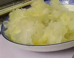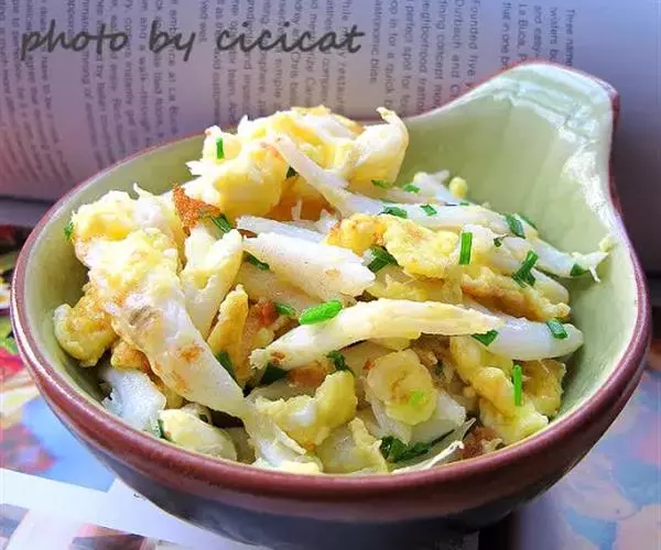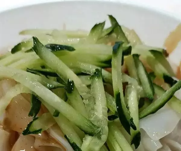 待其冷却后切成普通面条状,调入新泼油的辣椒,香醋,盐水,也可放入新切的生黄瓜丝,其味更加爽口。