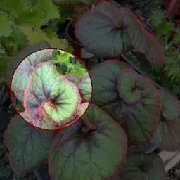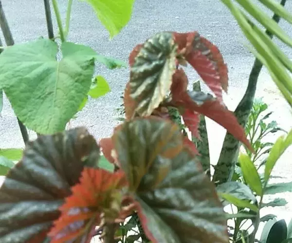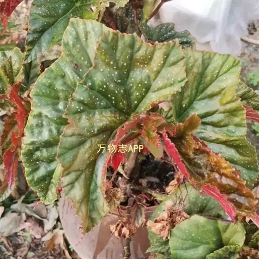 多年生草本。茎直立,平滑,有分枝,高60-100厘米.叶质厚,斜长圆形至长圆状卵形,基部心形,长10-20厘米,叶缘波状,无齿,下面红色,上面有无数圆白点叶片斜椭圆形状披针形,叶表面灰绿色具银白色圆斑玉边缘,叶背面暗红色,在光线作用下叶片呈红褐色,圆斑和边缘呈黄绿色。