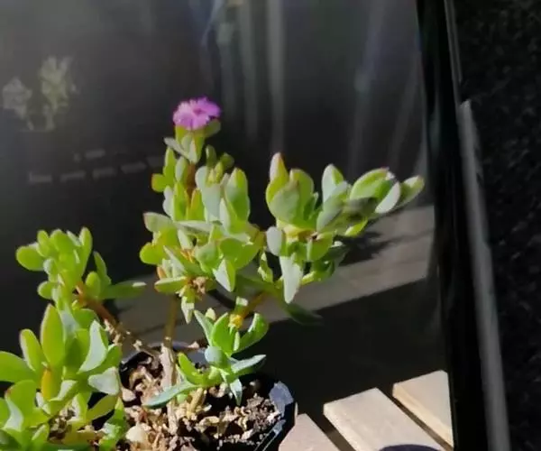 白凤菊(Oscularia pedunculata),别名姬鹿角,番杏科、覆盆花属,原产地位于南非及美国部分沿海地区。喜温暖干燥和阳光充足的环境,耐旱,怕水湿,无明显休眠期。多年生肉质植物,大株植物呈亚灌木状,茎分枝匍匐或直立,老枝茎干呈棕红色,嫩枝稍带浅红色或黄绿色,叶着生于茎节处,肉质多汁具三棱形,边缘有小锯齿,花顶生头状花序,花瓣、花丝呈淡紫色,花药呈黄色,花期春末夏。可通过分株或扦插繁殖。