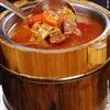 3. 把黄酒、花椒粉、葱姜末、酱油、红糖、老汤、食用油、味精一起调好放入南瓜内,再将洗干净的五花肉放入南瓜内,将南瓜放在盘上,上笼蒸熟即可。