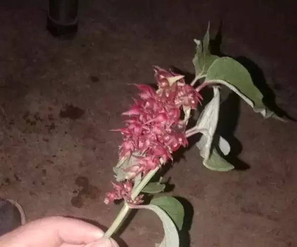 穗状花序顶生或腋生,每节具6朵花,具3朵花的聚伞花序对生,中央1花无柄,侧生2花具极短的柄,总花梗长 (8-) 10-25 (-30) 毫米;苞片叶状,绿色、带紫色或紫红色,每轮6枚,最下面一对较大,阔卵形、卵形至披针形,长达2 (-3.5) 厘米,先端短尖至尾尖;小苞片极小,长不足1毫米;萼筒矩圆形,长3-4毫米,密生糙毛和短腺毛,萼檐深5裂,裂片圆卵形、披针形至条状披针形,长1-3 (-5) 毫米,常2长3短;花冠白色或粉红色,有时带紫红色,漏斗状,长 (1.2-) 1.4-1.8厘米,外面被短柔毛,裂片圆卵形,长5毫米左右,筒外面基部具5个膨大成近圆形的囊肿,囊内密生淡黄褐色蜜腺;雄蕊约与花冠等长,花药矩圆形;花柱稍伸出花冠,柱头盾状;子房5室。