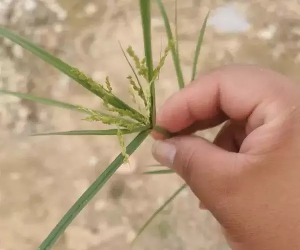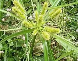 碎米莎草(拉丁学名:Cyperus iria L.):为单子叶植物纲莎草科莎草属一年生草本,无根状茎,具须根。秆丛生,细弱或稍粗壮,高8-85厘米,扁三稜形,基部具少数叶,叶短于秆,宽2-5毫米,平张或折合,叶鞘红棕色或棕紫色。小坚果倒卵形或椭圆形,三稜形,与鳞片等长,褐色,具密的微突起细点。花果期6-10月。