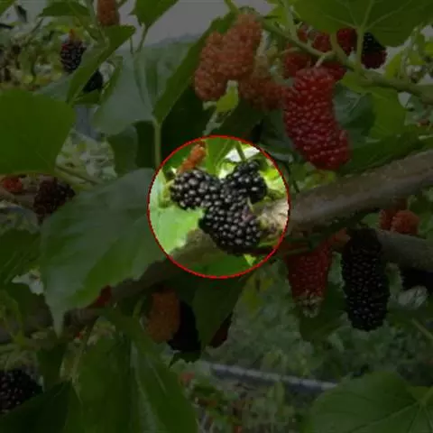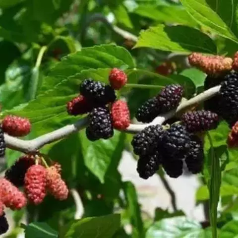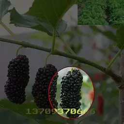 该变种和桑的区别在于叶大而厚,叶长可达30厘米,表面泡状皱缩;聚花果圆筒状,长1.5-2厘米,成熟时白绿色或紫黑色。