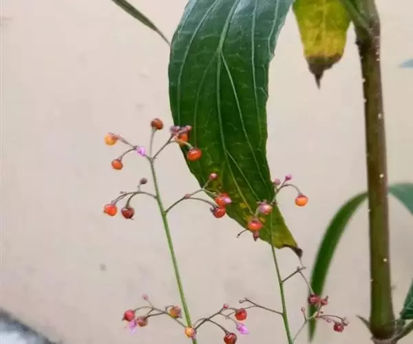 圆锥花序顶生或腋生,较大形,常二叉状分枝,具长花序梗;花小,直径约6毫米;总苞片绿色或近红色,圆形,顶端圆钝,长3-4毫米;苞片2,膜质,披针形,顶端急尖,长约1毫米;花梗长5-10毫米;萼片卵形,紫红色,早落;花瓣粉红色或淡紫红色,长椭圆形、倒卵形或椭圆形,长6-12毫米,顶端圆钝,稀微凹;雄蕊(10-)15-20,比花瓣短;花柱线形,长约2毫米,基部具关节;柱头3裂,稍开展;子房卵球形,长约2毫米。蒴果近球形,直径约4毫米,3瓣裂,坚纸质;种子多数,扁圆形,直径约1毫米,黑褐色或黑色,有光泽。花期6-7月,果期9-10月。