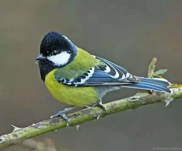 雌雄羽色相似,额、眼先、头顶、枕至后颈黑色具蓝色光泽,眼下、面颊、耳羽和颈侧白色,后颈黑色向两侧延伸,沿白色脸颊下缘与颏、喉和前胸黑色相连,使脸颊白斑被围成一个近似三角形的白斑。上背和两肩黄绿色,后颈黑色下面亦有一白斑,白斑与上背间黄色,下背和腰蓝灰色。尾上覆羽暗灰蓝色,羽缘较淡,尾黑褐色,外翈羽缘灰蓝色,最外侧一对尾羽外翈几全为白色,其余外侧尾羽具白色端斑。翅上覆羽黑褐色,小覆羽具暗灰色羽缘,大覆羽和中覆羽外翈具灰蓝色羽缘和宽阔的灰白色端斑,在翅上形成两道明显的白色翅带。飞羽黑褐色,除最外侧两枚初级飞羽外,其余初级飞羽外翈羽缘灰蓝色,向羽端逐渐变为灰白色,次级飞羽外翈羽缘亦为灰蓝色,羽端白色,三级飞羽具宽阔的灰白色端斑。颏、喉和前胸黑色微具蓝色金色光泽,其余下体辉黄色,两胁辉黄沾绿色,腹部中央有一宽的黑色纵带,其前端与黑色的胸相连,后端延伸至尾下覆羽。尾下覆羽黑色具宽阔的白色端斑,腋羽黄色,翅下覆羽黑褐色、羽端白色,胫羽黑色,胫下部具白色羽端。 雌鸟腹部中央黑色纵带较雄鸟稍较细窄,其余和雄鸟相似。幼鸟和成鸟相似,体色较暗淡而少光泽,头侧白斑沾黄,腹部黄色亦较淡,腹中央不具黑色纵带或黑色纵带不明显。虹膜褐色,嘴黑色,脚铅黑色。