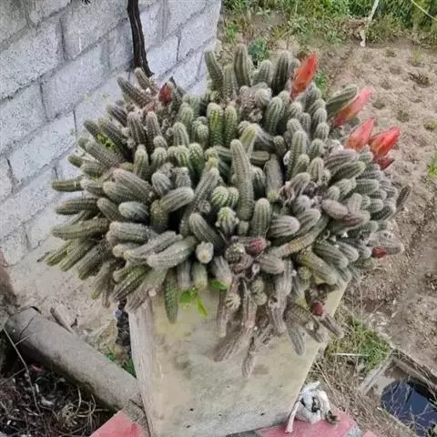 多年生肉质植物,茎幼时球形,后随年龄增长渐变为圆筒形,直径20cm,高可达5m以上,易群生,蓝绿色,棱11—15。茎 顶密生绒毛。刺座密集,放射状刺12—15,毛状,黄白色,中刺8—12,针状,褐色。两种刺长均为约0.5cm—0.8cm。花大,直径达5cm—6cm,花冠漏斗状,鹅黄色。花期6—7月。