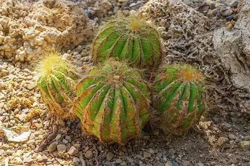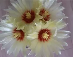 英冠玉初球状单生,后圆筒状并且群生,表皮蓝绿色,顶部密生白色绒毛,棱11~15。刺座密集,周刺12~15,黄白色毛状;中刺8~12,针状褐色,所有刺仅0.5~0.8cm长。漏斗状花5cm大,硫磺色,雄蕊雌蕊都为黄色。