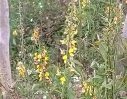 总状花序顶生,下垂,长10-30厘米;花序轴被银白色柔毛;苞片线形,早落;花长约2厘米,多数;花梗细,长8-14毫米;小苞片线形;萼歪钟形,稍呈二唇状,长约5毫米,上方2齿尖,下方3齿尖,均甚短,被贴伏细毛;花冠黄色,无毛,旗瓣阔卵形,先端微凹,基部心形,具短瓣柄,翼瓣几与旗瓣等长,长圆形,先端钝,基部具耳,龙骨瓣阔镰形,比前二者短三分之一;雄蕊单体;子房线形,具柄,胚珠8粒,花柱细,短于子房。荚果线形,长4-8厘米,先端锐尖,基部楔形,缝线增厚,被贴伏柔毛。种子黑色。花期4-6月,果期8月。